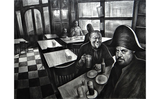 • Selfie en el Británico, carbonilla sobre tela, 150x200 cm