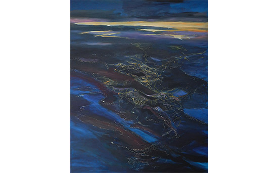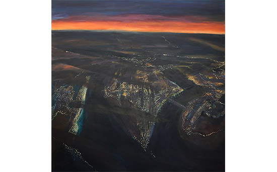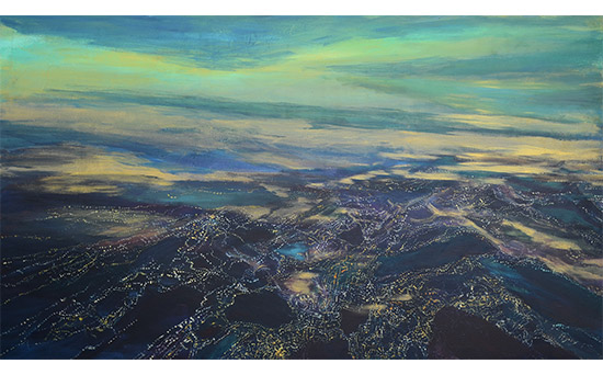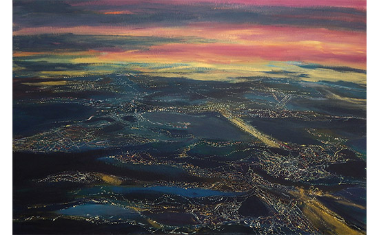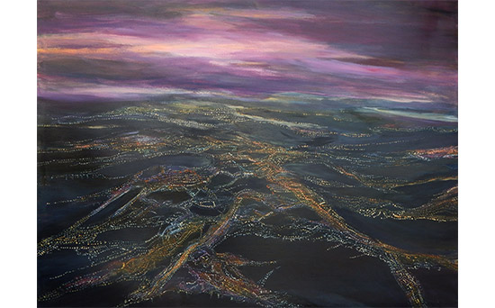 Podrían ser imágenes de la superficie terrestre tomadas desde un avión, visiones que permiten la observación de grandes extensiones de terreno, estructuras, texturas y elementos como puentes, carreteras y ríos, de las que se utilizan para la realización de cartografías por su capacidad de revelar detalles no visibles desde el suelo. Se trata sin embargo de perspectivas ficcionales, territorios evocados construidos por la artista en continuidad narrativa. Refulgencias nocturnas desde la altura en la que imaginariamente se ubica: a diez mil pies.