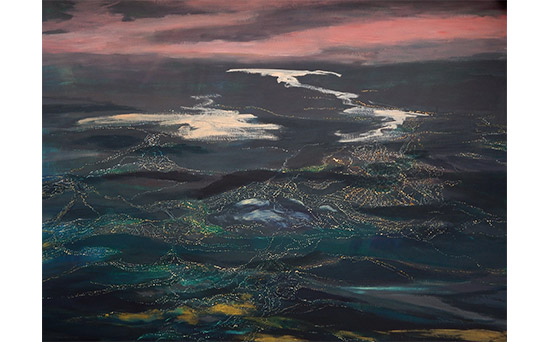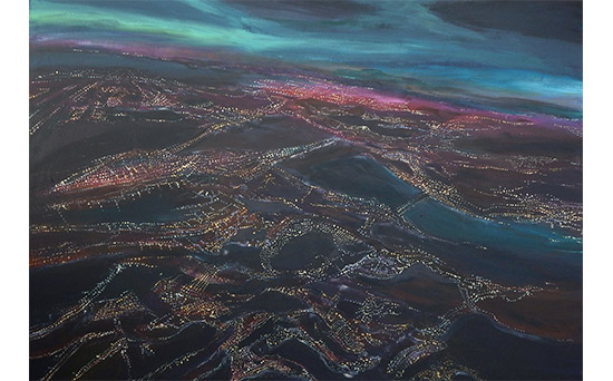 Podrían ser imágenes de la superficie terrestre tomadas desde un avión, visiones que permiten la observación de grandes extensiones de terreno, estructuras, texturas y elementos como puentes, carreteras y ríos, de las que se utilizan para la realización de cartografías por su capacidad de revelar detalles no visibles desde el suelo. Se trata sin embargo de perspectivas ficcionales, territorios evocados construidos por la artista en continuidad narrativa. Refulgencias nocturnas desde la altura en la que imaginariamente se ubica: a diez mil pies.